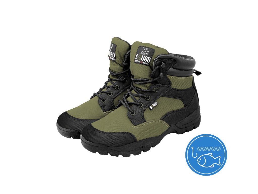 Boty Delphin SQUAD byly navrženy tak, aby byla dosažena maximální možná voděodolnost, zároveň prodyšnost a tepelný komfort. SQUAD jsou tedy velmi pohodlnou obuví při delším stání či sezení při čekání na záběr, jsou však stejně pohodlné při procházkách kolem revírů či v horách. Na povrchu je použita velmi pevná tkanina, která dobře odolává vodě, ale i ostrým předmětům. Pryžová podrážka neklouže, hrubý dezén napomáhá při překonávání terénních překážek. Boty se šněrují přes 4 očka a 2 háčky. Jazyk je prošitý až do části s háčky, do této výšky se můžete krátkodobě pohodlně pohybovat v mokrém a vlhkém prostředí. Mezi vnější a vnitřní mikrofleecovou vrstvou se nachází izolační vrstva 3M Thinsulate, která je vyrobena ze syntetických vláken s velmi vysokou hustotou. Nepromokavost, dobrá tepelná izolace a pohodlí nošení. To jsou 3 hlavní atributy bot Delphin SQUAD. Kromě rybářů jsou velmi vhodné i pro myslivce, turisty a všechny milovníky přírody.Doplňkové parametry