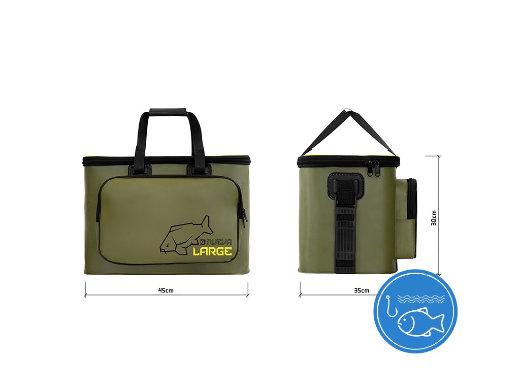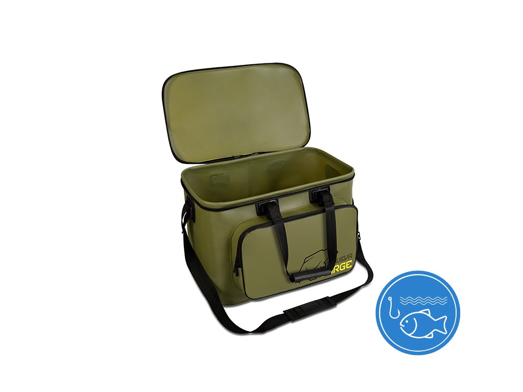 CarryAll taška Delphin NuEVA Large o rozměrech 45x30x35cm je univerzální rybářská taška vyrobená z EVA materiálu, poskytující velkorysý prostor pro uskladnění nejrůznějšího rybářského vybavení či různých nástrah a návnad. Díky použitému EVA materiálu a kvalitním svárům je taška nepromokavá, čímž dokonale ochrání obsah uvnitř i v nepříznivých povětrnostních podmínkách. Kromě nepromokavosti je tento materiál také velmi snadno omyvatelný a neabsorbuje pachy. Bez obav tak uvnitř můžete přenášet také různé tekuté potravy, dipy či boostry. Extra prostor pro drobnější příslušenství poskytuje zipovatelná kapsa na přední straně. Série tašek NuEVA je designována v kombinaci decentní barvy s logem kapra, což potěší množství příznivců kaprařiny. Pro snadný transport je taška opatřena praktickým, délkově nastavitelným popruhem na rameno, ale také dvěma popruhy do ruky. Rozměr: 45x30x35cm Rozměr přední kapsa: 35x20x6cmDoplňkové parametry