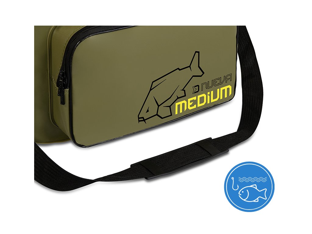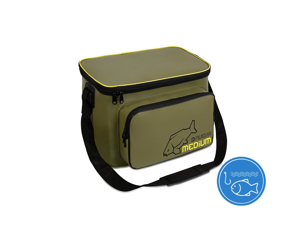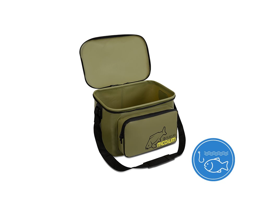 CarryAll taška Delphin NuEVA Medium o rozměrech 35x25x30cm je univerzální rybářská taška vyrobená z EVA materiálu, která poskytuje dostatečný prostor pro uskladnění nejrůznějšího rybářského vybavení či různých nástrah a návnad. Díky použitému EVA materiálu a kvalitním svárům je taška nepromokavá, čímž dokonale ochrání obsah uvnitř i v nepříznivých povětrnostních podmínkách. Kromě nepromokavosti je tento materiál také velmi snadno omyvatelný a neabsorbuje pachy. Bez obav tak uvnitř můžete přenášet také různé tekuté potravy, dipy či boostry. Extra prostor pro drobnější příslušenství poskytuje zipovatelná kapsa na přední straně. Série tašek NuEVA je designována v kombinaci decentní barvy s logem kapra, což potěší množství příznivců kaprařiny. Pro snadný transport je taška opatřena praktickým, délkově nastavitelným popruhem na rameno. Rozměr: 35x25x30cm Rozměr přední kapsa: 30x20x6cmDoplňkové parametry