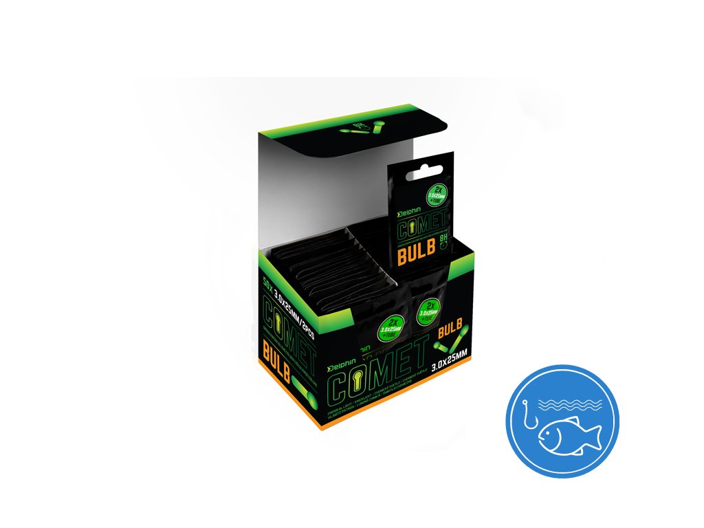 Chemické světlo Comet BULB je vynikajícím pomocníkem při večerním a nočním lovu. Díky svému tvaru "žárovky" je ideální na osvětlení například splávku, na který se dá Comet BULB upevnit pomocí gumové trubičky. Manipulace s tímto světlem je velmi jednoduchá. Zlomením žluté části uvnitř dojde k chemické reakci, která způsobí svícení této tyčinky. Pro rovnoměrné svícení doporučujeme po zlomení tyčinkou párkrát zatřást. Světlo je dostupné ve dvou velikostech. Díky pokrokové technologii je doba svícení až 8 hodin!Doplňkové parametry