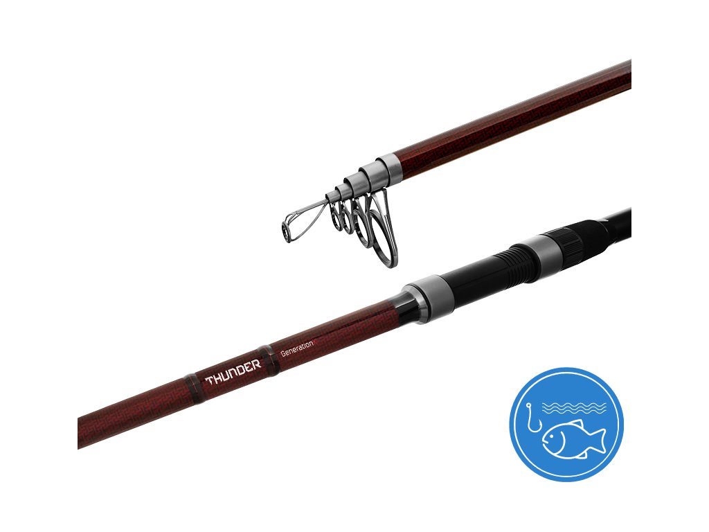 Univerzální teleskopický prut THUNDER, který si za několik let vybudoval pověst doslova nezničitelného nástroje pro lov ryb přichází v novém hávu s označením GenerationX. Základem tohoto prutu je velmi silný uhlíkový blank, který si poradí s plnou zátěží při nahazování, ale také při zdolávání kapitálních úlovků. Jednotlivé díly jsou osazeny pevnými očky se SiC výplní, které díky svému rozložení ideálně vedou vlasec a minimalizují tření. Použité DPS sedlo spolehlivě udrží na svém místě i největší navijáky. Délka rukojeti je srovnatelná s klasickými dělenými kaprařskými pruty, což umožňuje pohodlné a daleké nahazování. Na konci je rukojeť opatřena rozšířenou EVA pěnou, kvůli komfortnějšímu úchopu a snazší manipulaci. Jasným rozpoznávacím znakem tohoto modelu je charakteristická bordó barva. Oproti předchozí verzi jsme sérii THUNDER rozšířili o nové kompaktnější délky a to 300 a 330 cm. Technické parametry: Model: 300cm/100g Počet dílů: 5 Počet oček: 5 Průměr blanku nad rukojetí: 19,65mm Hmotnost: 306g Transportní délka: 120cm Rukojeť: dělená, EVA pěna Délka rukojeti (od spodní části prutu po střed sedla): 55,5cm Model: 330cm/120g Počet dílů: 5 Počet oček: 5 Průměr blanku nad rukojetí: 19,67mm Hmotnost: 338g Transportní délka: 124,5cm Rukojeť: dělená, EVA pěna Délka rukojeti (od spodní části prutu po střed sedla): 58,5cm Model: 360cm/140g Počet dílů: 6 Počet oček: 5 Průměr blanku nad rukojetí: 22,49mm Hmotnost: 430g Transportní délka: 121cm Rukojeť: dělená, EVA pěna Délka rukojeti (od spodní části prutu po střed sedla): 66,5cm Model: 390cm/140g Počet dílů: 6 Počet oček: 5 Průměr blanku nad rukojetí: 22,42mm Hmotnost: 440g Transportní délka: 124cm Rukojeť: dělená, EVA pěna Délka rukojeti (od spodní části prutu po střed sedla): 69cmDoplňkové parametry