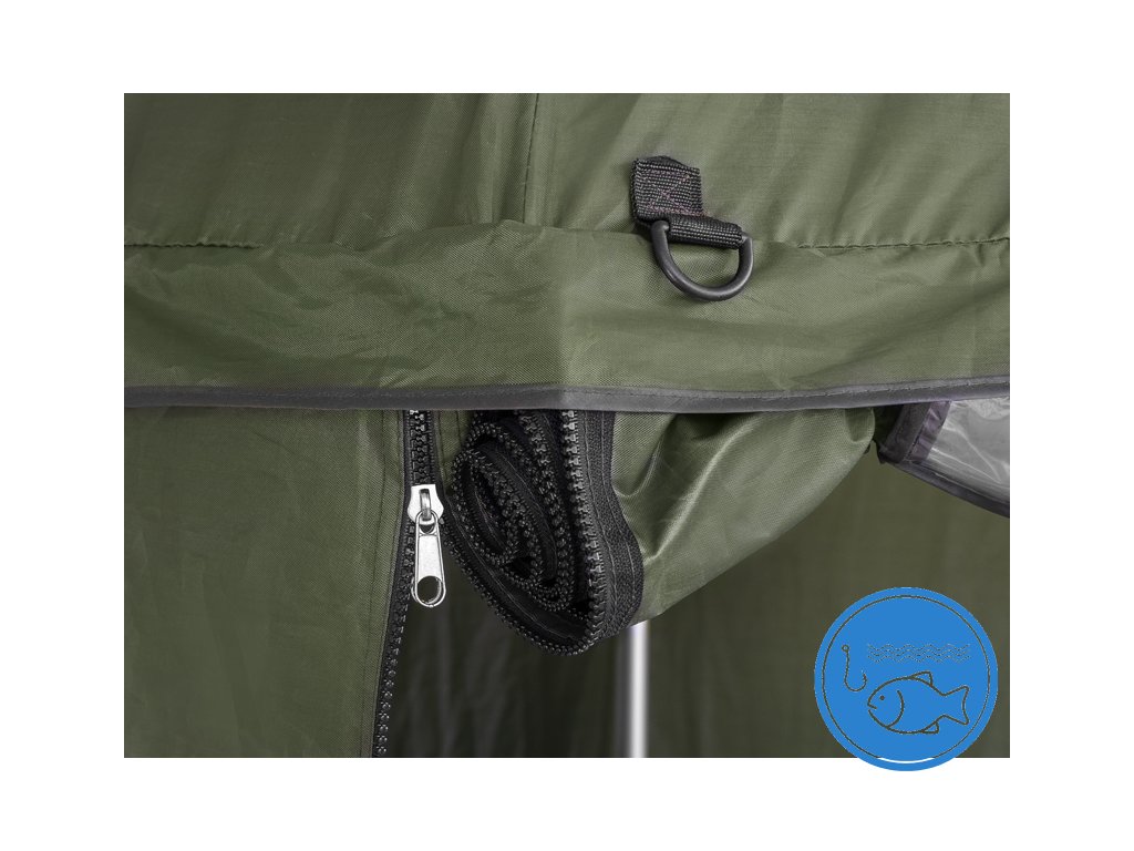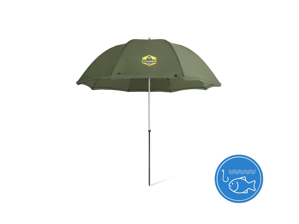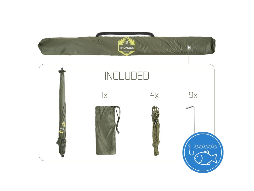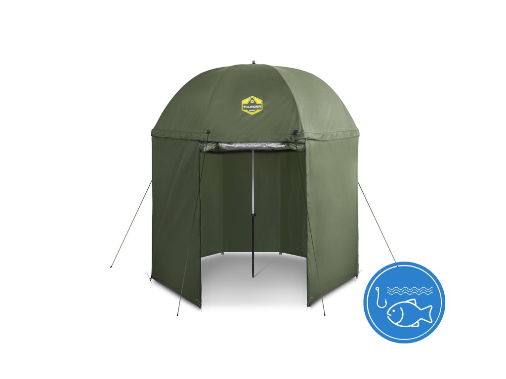 Deštník s kompletně uzavíratelnou bočnicí Delphin THUNDER FullWALL je ideální volbou do nepříznivého počasí během kratších výprav. Perfektně ochrání před nepříjemným sluncem, ranní rosou, ale i vyšším úhrnem srážek. Pro lepší stabilitu ve větru je opatřen čtyřmi ukotvovacími lany. Švy deštníku jsou důkladně podlepeny voděodolnou páskou pro zajištění 100% nepromokavosti i v případě silného deště. Díky boční prodloužené stěně po celém obvodu budete před nepříznivými podmínkami chráněni ze všech stran. Bočnice disponuje dveřmi, které jsou opatřeny kvalitními zipy. Kromě toho se na dveřích nachází průhledné plastové okno, díky kterému budete z deštníku vidět na pruty i za deště. Spodní část boční stěny je osazena úchyty pro připevnění k zemi pomocí zajišťovacích kolíků, které jsou součástí balení. Výšku a sklon deštníku lze přizpůsobit podle potřeby, což zároveň usnadní jeho upevnění i v členitějším terénu. Technické parametry: Max.výška deštníku (až po vrch kopule): 215cm Max. výška deštníku (s upevněnou boční stěnou): 200cm Průměr přes kopuli: 250cm Transportní rozměry: 135x12x12cm Hmotnost: 3kgDoplňkové parametry