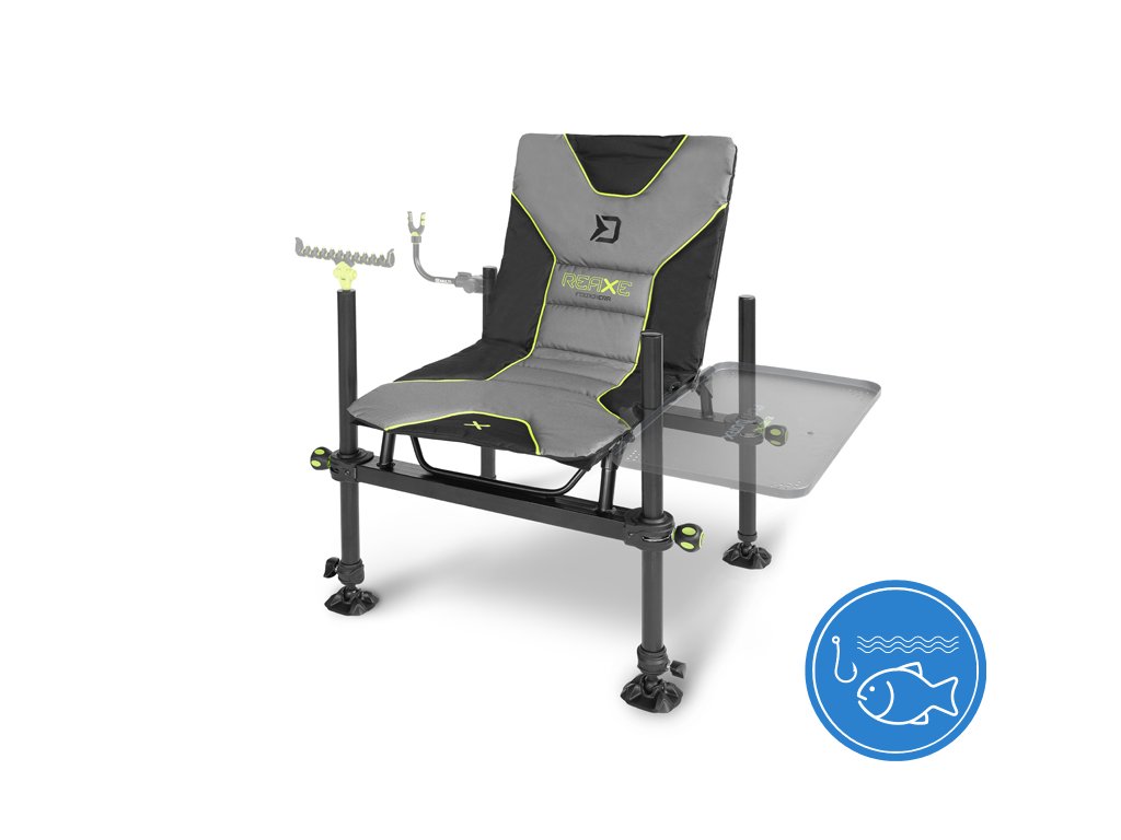 Exkluzivní feederové křeslo, spojující vlastnosti klasických rybářských křesel a luxusních závodních beden. Je postaveno na pevném kovovém rámu se čtyřmi otvory pro výsuvné nohy, které jsou vybaveny mohutnými šrouby s velkými pogumovanými madly. Šrouby jsou otočné kolem osy otvoru a tím pádem je lze zatáhnout ve více pozicích, čímž poskytují větší variabilitu během nastavování výšky nohou. Hrubé hliníkové nohy disponují velkými patkami s kloubovým uchycením a jsou tedy nastavitelné pro různý sklon a nerovnosti terénu. Přední nohy jsou zároveň teleskopické a také výsuvné z kovové konstrukce, takže zvládnou také lov na hrázích a jiných šikmých plochách. Na vrchu předních nohou se nacházejí univerzální závity, které lze využít pro uchycení různých feederových držáků nebo jiných doplňků. Sedací část je tvořena měkkou matrací, která umožňuje komfortní sezení během celodenního lovu. Barevně je laděna do šedo-černa, s výraznými zelenými doplňky ve stylu REAXE. Křeslo je také kompatibilní s naším feederovým ramenem ProfixARM, se stolkem FlatWORX, případně s dalšími držáky s odpovídajícím průměrem otvoru. Po ukončení lovu lze nohy z křesla vytáhnout a sklopit konstrukci, čímž křeslo nabude skutečně kompaktní celkové rozměry, které vám usnadní následný transport. Technické parametry: Rozměr sedáku: 50x50cm Výška zádové opěrky: 53cm Výška sedáku: 27-70cm Hmotnost křesla: 5,6kg Hmotnost nohou: 2,6kg Přepravní rozměry:75x69x13cm Průměr nohou: 36mm Celková výška: 84 - 127cm Šířka: 65 - 85cm Přední nohy: max. 116cm, min. 67cm Zadní nohy: 60cmDoplňkové parametry