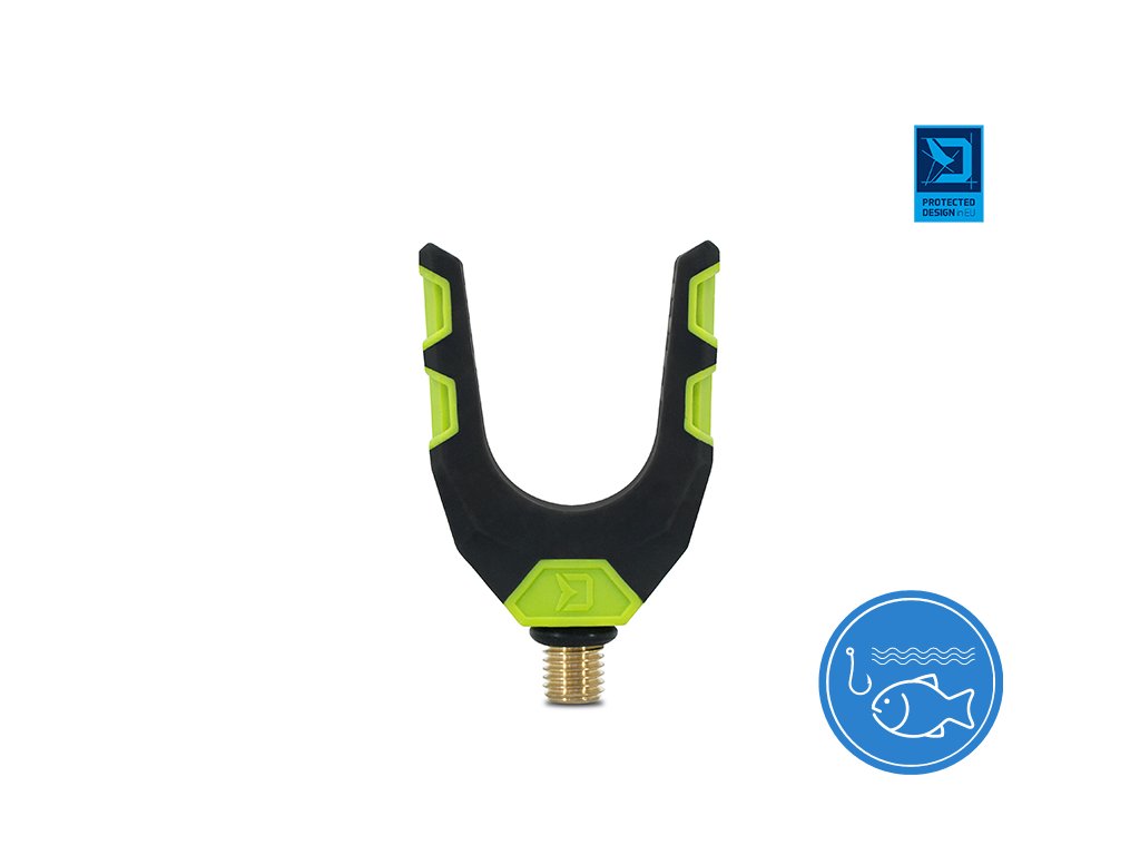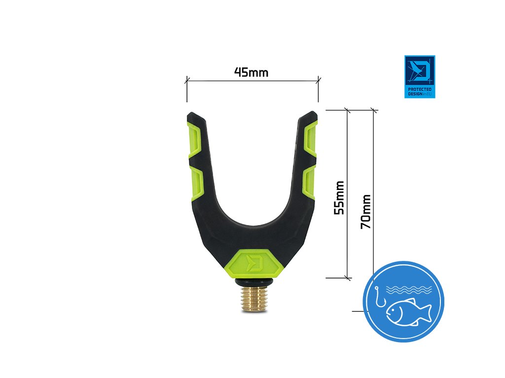 Zadní držák prutu tvaru U, navržený v barvách inovativní feederové série Delphin Reaxe. Držák se vyznačuje excelentním zpracováním a vyniká svojí robustností a odolností. Speciálně navržený tvar umožňuje uložení prutů s různými průměry rukojetí. Povrch je potažen pogumovaným materiálem, který je extra šetrný k povrchu prutu a chrání jej před poškozením. Držák je vyroben z odolných materiálů, takže se snadno nepoškodí a nepoškrábe. Univerzální závit umožňuje uchycení na všechna standardní ramena, stojany a vidličky. Na závitové části se nachází gumová podložka, která zamezuje otáčení držáku. Technické parametry: Celková výška: 55mm Celková šířka:45mmDoplňkové parametry