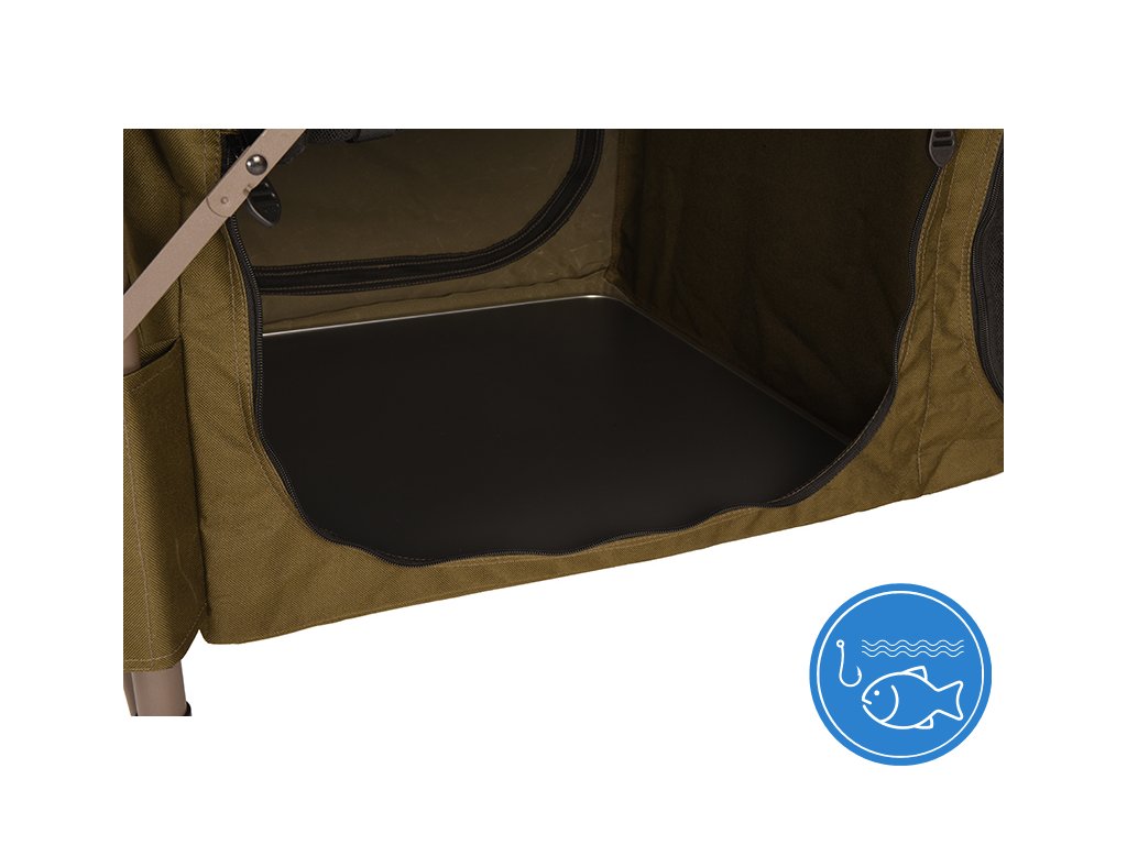 - Zelená, odolná polyesterová tkanina s přístupovými panely ze síťoviny