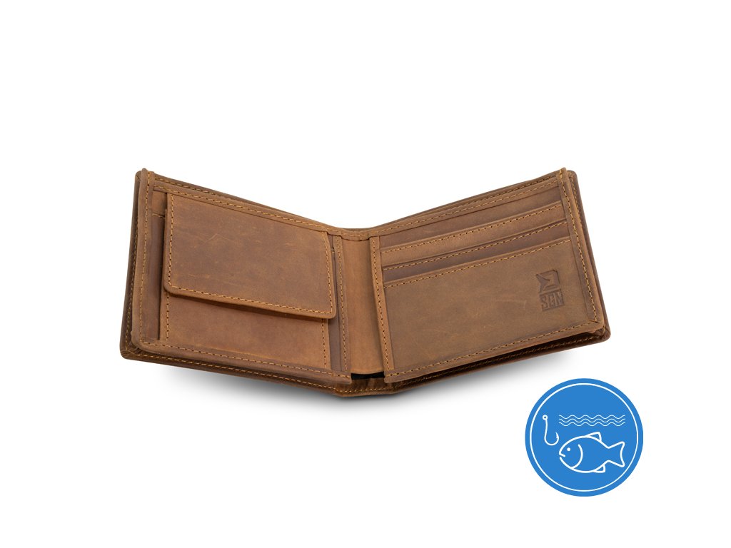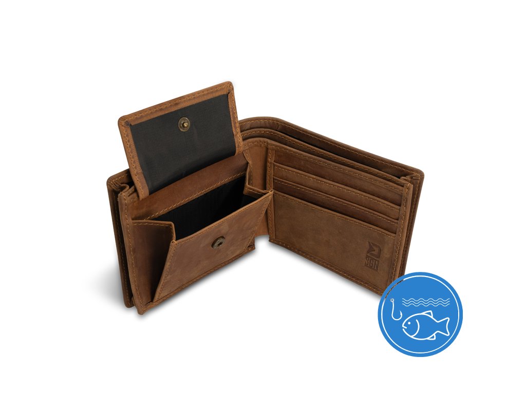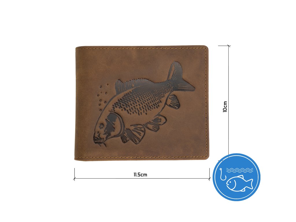 Stylová kožená peněženka vylepšená klasickým motivem kapra, která bezpečně uchová vaše doklady i hotovost. Obsahuje několik přihrádek na platební a zákaznické karty, zapínací kapsu určenou pro mince, případně žetony a samozřejmě nechybí dvě přihrádky pro uložení bankovek. Peněženka je vyrobena z pravé kůže tmavě hnědé barvy, díky čemuž se vyznačuje kvalitou, odolností a příjemně se drží v ruce.Doplňkové parametry