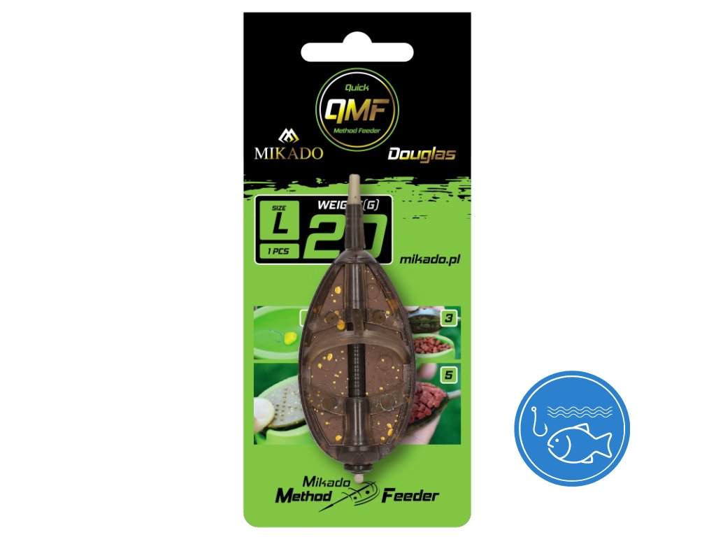 Nová verze skvělých krmítek Douglas Method Feeders. Q.M.F. je systém, který umožňuje rychle a snadno vyměnit krmítko, aniž by bylo nutné přezbrojovat celou udici. Vše, co musíte udělat, je odstranit gumovou převlečkui, vyjmout krmítko z trnu a vyměnit za jiné.Doplňkové parametry