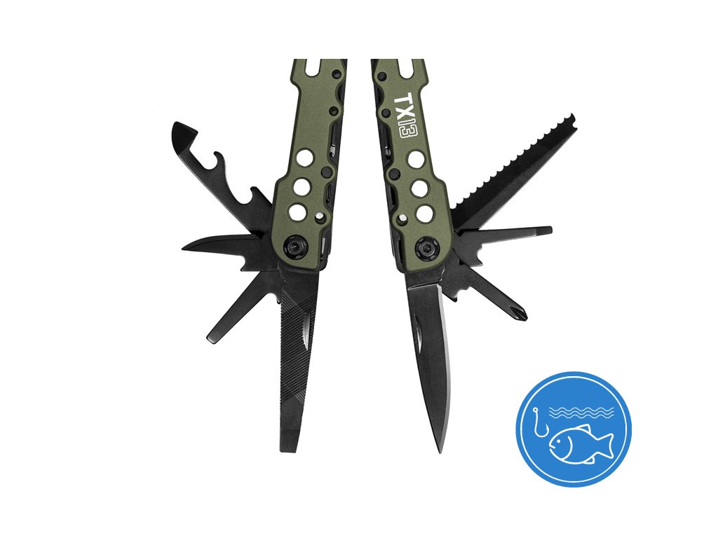 Do posledního detailu propracované kleště s velkým množstvím funkcí, které vás zachrání v nejedné situaci. Delphin TaktyX 13 jsou vyrobeny z kvalitní nerezavějící oceli Inox. Tak jak napovídá číslice v názvu, disponují až 13-ti různými nástroji resp. funkcemi. Kromě klasických kombinovaných kleští se zde nachází nůž, pilka, otvírák na konzervy a láhve, pilník, nůžky na drát, děrovačka a 4 různé šroubováky. Každý z těchto nástrojů se po vyklopení automaticky zajistí pomocí spolehlivého systému, díky čemuž nehrozí zaklápění během používání. Díky množství funkcí si kleště hravě poradí s různými opravami, přípravou návazců, jídla, ale i vyjímáním háčků z rybích tlam. Jsou tedy vhodné pro všechny rybáře, outdoorové nadšence, ale i pravé domácí kutily. Multifunkční kleště TaktyX13 jsou dodávány s praktickým pouzdrem, které lze snadno upevnit na opasek.Doplňkové parametry