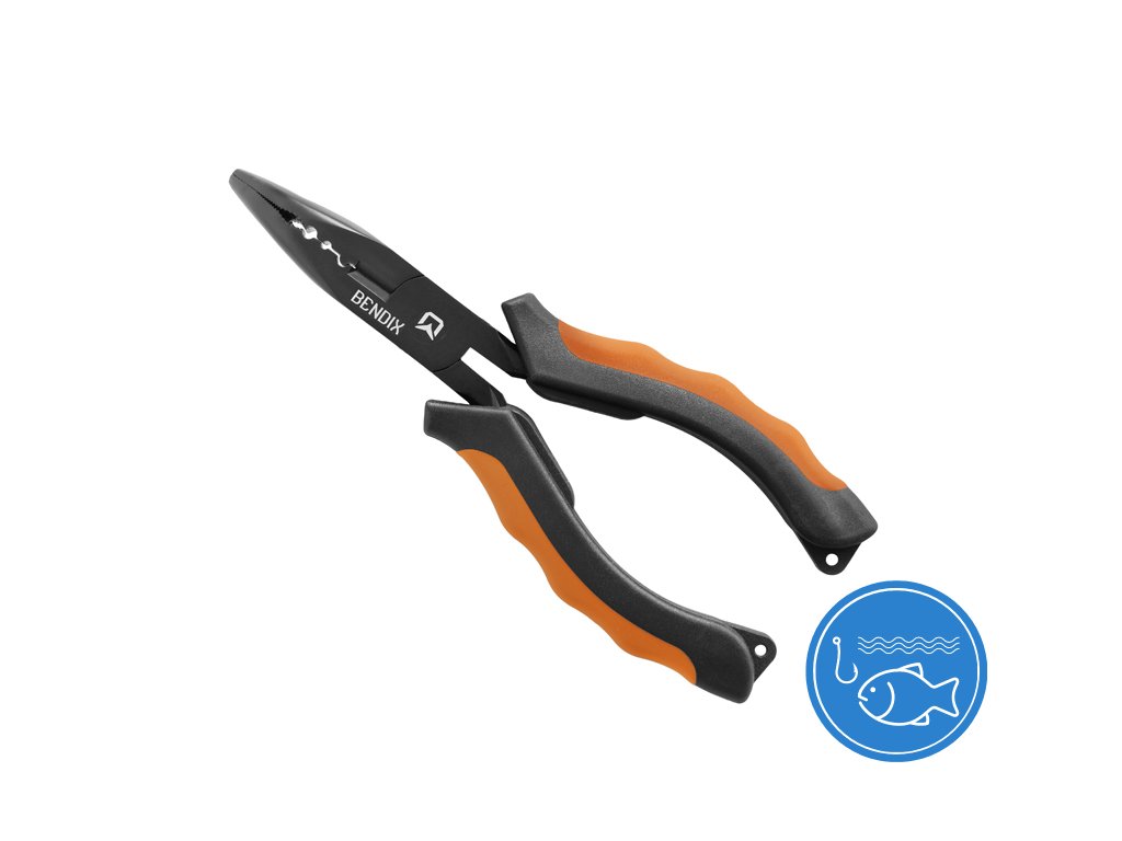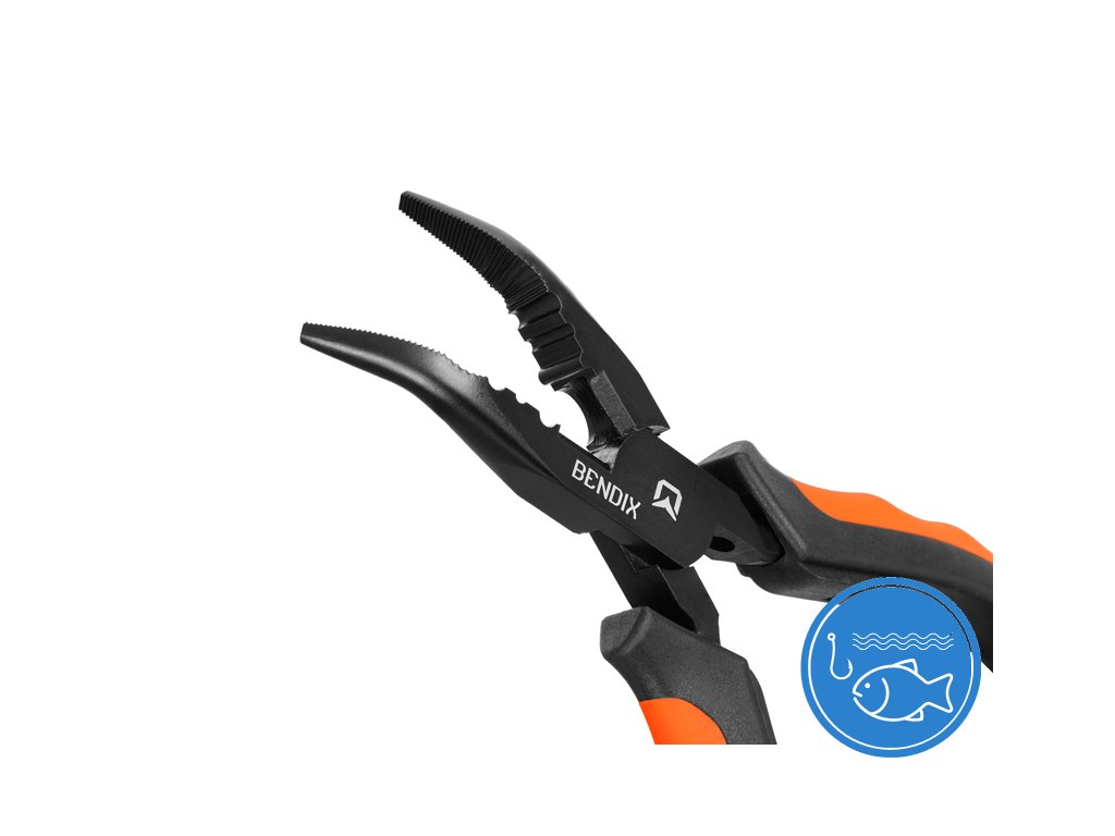 Delphin BENDIX jsou multifunkční kleště se zahnutou špičkou, které jsou určeny pro uvolňování háčků z tlam dravých ryb v případech zaseknutí v té nejtvrdší části. Jejich délka je 16cm. Vnitřní strana ramen kleští poskytuje dostatečně drsnou plochu pro uchopení i velkých háčků včetně dvou a trojháčků. Navíc jsou jejich čelisti vybaveny střihačem ocelových a wolframových lanek a krimpovací částí pro jednoduché i dvojité krimpy. Jsou vyrobeny z oceli s vysokým podílem uhlíku a jejich obě rukojeti jsou vybaveny plastem oranžové a černé barvy, které jsou dobře viditelné za každých podmínek a dobře padnou do ruky. Na obou ramenech rukojeti se nacházejí otvory pro provlečení šňůrky. S kleštěmi BENDIX budete připraveni na každou situaci při lovu dravců.Doplňkové parametry