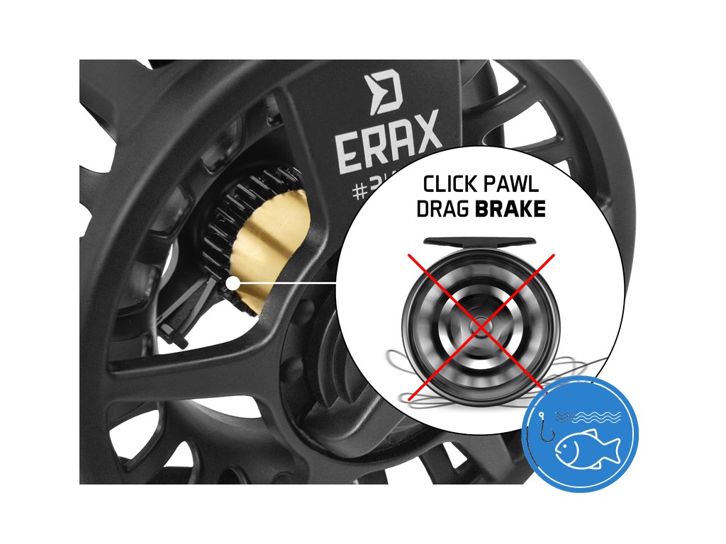 Delphin ERAX je celokovový muškařský naviják se širokou a z obou stran vyvýšenou cívkou pro lepší ukládání podkladové šňůry. Černá matná barva nezpůsobuje odlesky, a tak nebudete u vody plašit ryby nechtěným odrazem. Velkou výhodou muškařského navijáku ERAX je citlivá brzda, která je ukryta v pouzdru navijáku, kvůli odolnosti vůči písku a jiným nechtěným nečistotám, zejména při namočení navijáku do vody během lovu. Brzda je opatřena perkovým systémem, díky čemuž i při rychlých výpadech nevznikne nechtěné odmotání šňůry, a tím se zamezí různým uzlům, které by mohly způsobit ztrátu úlovku při zdolávání. Množství otvorů v konstrukci těla navijáku má dvě významné funkce. První z nich je výrazné odlehčení navijáku, čímž se lov s ním stává podstatně komfortnější. Druhou velmi užitečnou funkcí je urychlení schnutí muškařské šňůry a podkladového materiálu, což výrazně omezuje možnost rychlého znehodnocení muškařské výbavy. Naviják ERAX je dostupný ve 2 velikostech, konkrétně #3/4/5 a #6/7/8. Technické parametry: Model: #3/4/5 Kapacita: 20lbs backing 100m + WF-3 muškařská šňůra 20lbs backing 80m + WF-4 muškařská šňůra 20lbs backing 60m + WF-5 muškařská šňůra Průměr cívky: 45mm Šířka cívky: 26mm Počet ložisek: 1 Hmotnost: 134g Model: #6/7/8 Kapacita: 20lbs backing 100m + WF-6 muškařská šňůra 20lbs backing 80m + WF-7 muškařská šňůra 20lbs backing 60m + WF-8 muškařská šňůra Průměr cívky: 55mm Šířka cívky: 26mm Počet ložisek: 1 Hmotnost: 134gDoplňkové parametry