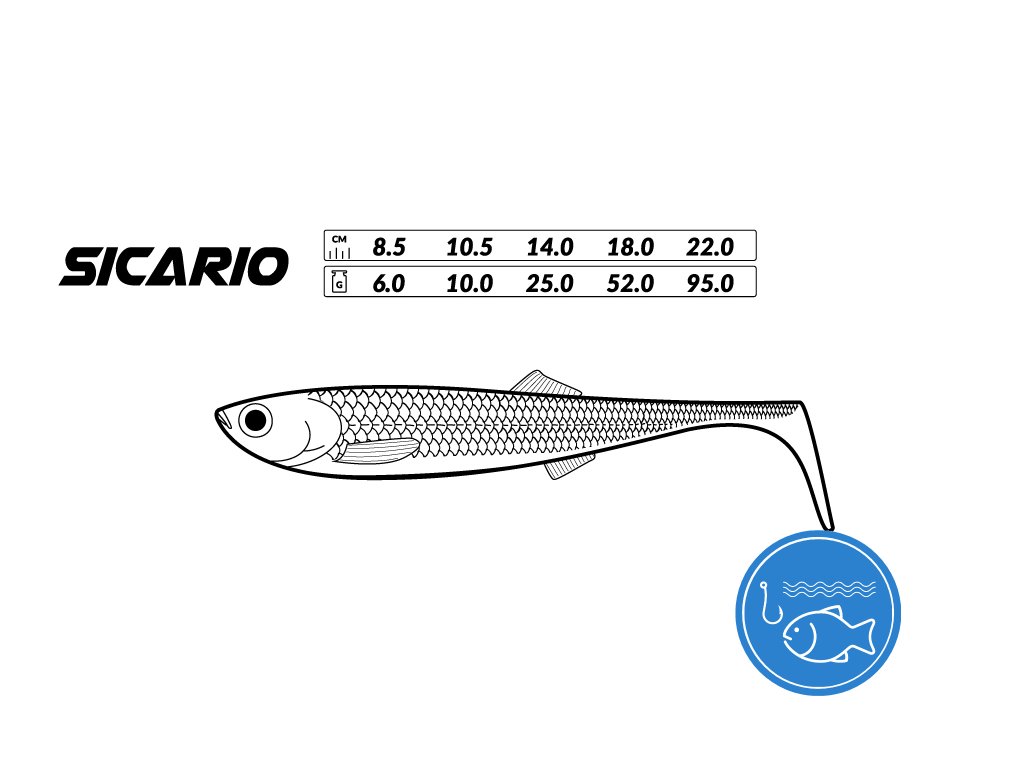 Díky realistickému vzhledu, intenzivní akci ocásku a výraznému chvění těla je měkká nástraha Sicario mimořádně efektivní pro lov různých druhů predátorů. Menší velikosti přilákají okouna a candáta, větší vám určitě přinesou štiku.Doplňkové parametry