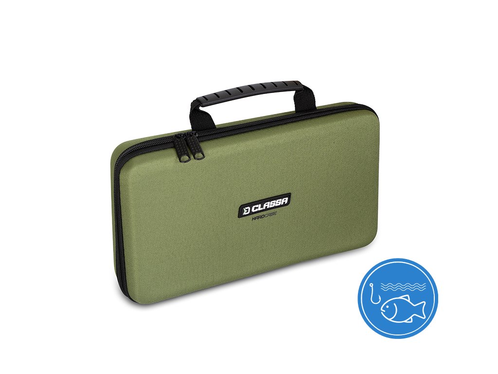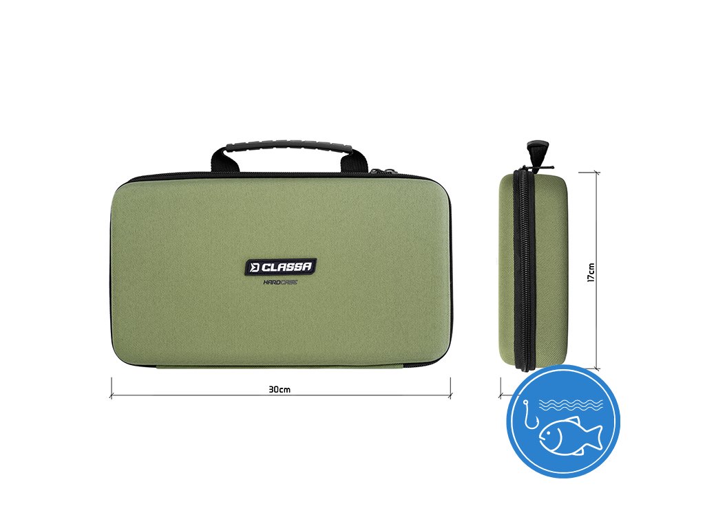 Série CLASSA zahrnuje kvalitní produkty za skvělou cenu a výjimkou není ani univerzální tvrzené pouzdro na rybářské příslušenství HardCASE. Je vyrobeno z odolného materiálu, potaženého nenápadnou tmavě zelenou tkaninou, takže taška si udržuje svůj tvar a v porovnání s běžnou látkovou taškou lépe odolává vnějším vlivům a nešetrnému zacházení. Kvalitní zip se dvěma běžci umožňuje zcela uzavření pouzdra. V přední části se nachází pogumované madlo, určené pro pohodlný přenos a vyjímání z větších tašek. Vnitřek je komplet vystlán měkkou pěnou s výstupky, tak aby bylo veškeré vaše vybavení perfektně fixováno a chráněno před mechanickým poškozením. Je vhodné zejména pro uložení méně objemného vybavení než sady signalizátorů, závěsné indikátory záběru, kratší hrazdy, markery, váhu a jiné předměty vyžadující intenzivnější ochranu. HardCASE si díky jeho kompaktním rozměrům komfortně pobalíte do většiny našich carryall tašek a batohů. Technické parametry Rozměr pouzdra: 30x17x6cmDoplňkové parametry