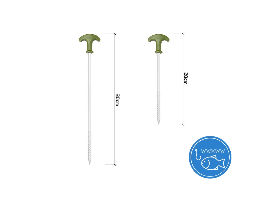 Set náhradních kolíků, pomocí kterého si můžete doplnit nebo nahradit své kolíky k bivaku, případně vylepšit slabší a tenčí typy k deštníkům nebo jiným menším přístřeškům. Disponují plně uzavřenými plastovými madly zelené barvy, jejichž výhodou je, že se ani po delší době zabíjení do země nezačnou uvolňovat a sesouvat po kovové tyčce směrem dolů. Vrták s odolným čtyřhranným hrotem napomáhá snadnějšímu zapíchnutí do tvrdé a suché půdy. Hroty jsou při koupi opatřeny transparentními ochrannými krytkami pro zvýšení bezpečnosti. Technické parametry: Sada kolíků Delphin CLASSA / 5ks | 20cm Délka kolíků: 20 cm Délka závitu: 7 cm Průměr ocelové tyče: 7 mm Počet kusů v balení: 5 Sada kolíků Delphin CLASSA / 5ks | 30cm Délka kolíků: 30 cm Délka závitu: 7 cm Průměr ocelové tyče: 7 mm Počet kusů v balení: 5Doplňkové parametry