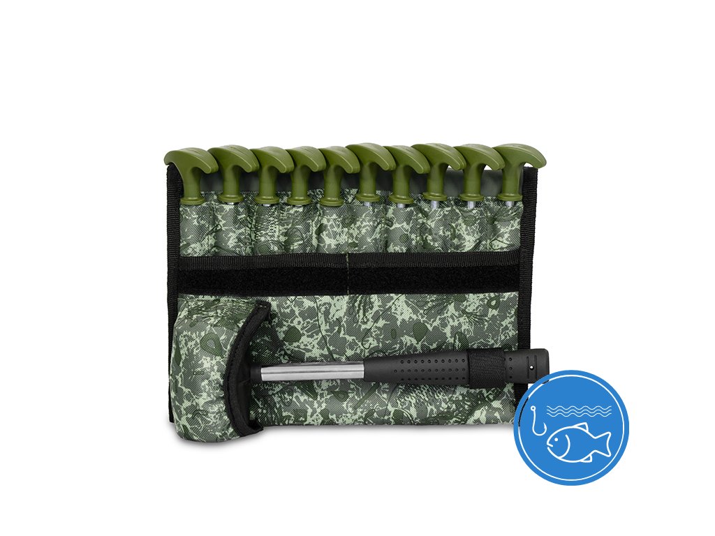Set obsahující 10 pevných, kovových kolíků s kladivem v praktickém pouzdru s C2G designem. Kolíky disponují plně uzavřenými plastovými hlavami zelené barvy, jejichž výhodou je, že se ani po delší době zabíjení do země nezačnou uvolňovat a sesouvat po kovové části směrem dolů. Vrták s odolným čtyřhranným hrotem napomáhá jednoduššímu zapíchnutí do tvrdé a suché půdy. Hroty jsou při koupi opatřeny transparentními ochrannými krytkami pro zvýšení bezpečnosti. Součástí balení je také pryžové kladivo s kovovou nohou a gumovou rukojetí černé barvy, sloužící pro snazší zabití kolíků do země. Samotné pouzdro je vyrobeno z odolné tkaniny, která je z vnitřní strany pogumovaná. Kladivo i kolíky jsou v pouzdru během transportu fixovány, takže nehrozí nechtěná ztráta kterékoli součásti balení. Technické parametry: Rozměry pouzdra: 27x22cm Délka kolíků: 20 cm Délka závitu: 7 cm Průměr ocelové tyče: 7 mm Počet kusů v balení: 10Doplňkové parametry