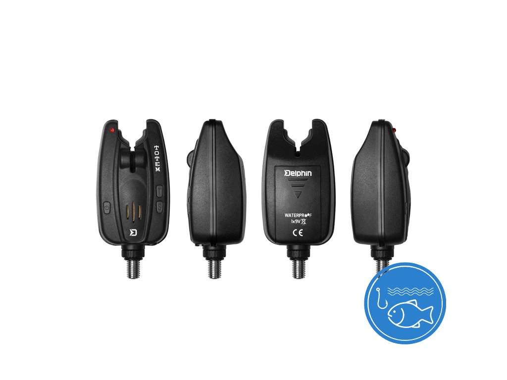 Extrémne kompaktné rozmery signalizátora a prijímača v ergonomickom tvare. Delphin TOTEM ponúka úplnú vodeodolnosť signalizátora a prijímač so skvelým dosahom až 150m v závislosti od okolitých podmienok. Signalizátor má ultra jasnú LED diódu s veľmi dlhou výdržou. Je napájaný 9V batériou čo zabezpečuje jeho dlhú dobu prevádzky. Dobrou vychytávkou je alarm, ktorý krátkym pípnutím a svietením LED diód upozorní na zníženie stavu kapacity batérie pod 5V (takisto pípne aj prijímač). TOTEM ponúka možnosť otestovania všetkých jeho funkcií. Má 4 úrovne hlasitosti vrátane tichého režimu, 4 rôzne tóny a 4 úrovne citlivosti. V tme určite oceníte možnosť zapnutia nočnej diódy. Vstup pre 2,5mm jack umožňuje pripojenie svietiaceho signalizátora záberu. Hrubé pogumovanie v časti kontaktu prúta so signalizátorom zamedzuje poškodenia prúta. Signalizátor po zábere svieti 15 sekúnd (takisto prijímač). Prijímač je napájaný 3 kusmi AAA batérií. Na zadnej strane má umiestnený odopínateľný klip pre upevnenie napríklad za opasok. Samozrejmosťou je tvrdý transportný kufrík pre bezpečný transport a ochranu sady mimo sezóny, tento kufrík pojme sadu až do konfigurácie 4+1. Prijímač má 5 úrovní hlasitosti vrátane tichého módu a možnosť nastavenia 4 úrovní tónu. TOTEM je kvalitný signalizátor so všetkými funkciami, ktoré využijete pri rybačke. Nočná LED dióda, vodeodolný alarm aj prijímač či test funkcii s upozornením na slabé batérie. To je iba pár výnimočných funkcii signalizátora Delphin TOTEM. Sadu Delphin TOTEM lze spárovat se světlem LightCONTACT.Doplňkové parametry