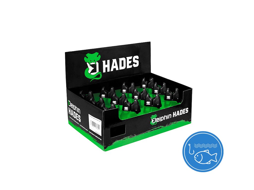 Delphin HADES je cenově velmi dostupný elektronický signalizátor záběru. Nabízí základní funkce světelné a zvukové signalizace. Je vybaven jednou záběrovou LED diodou a detekuje záběr v obou směrech. Jeho ovládání je opravdu velmi jednoduché a zvládne ho každý. Na spodní straně se nachází vstup pro 2,5mm jack konektor, a proto je možné i připojení závěsného signalizátoru záběru se zabudovanou světelnou signalizací. V přední části se nacházejí dva otočné ovladače. Vrchní ovladač slouží kromě ovládání hlasitosti i jako vypínač s aretací. Spodním ovladačem si můžete nastavit požadovanou výšku tónu. Signalizátor je vodotěsný, takže se o něj nemusíte obávat ani během deštivých dnů. Napájení je prostřednictvím 1 x 9V baterie. Při odběru 12 kusů signalizátorů HADES vám budou doručeny v pěkném prezentačním obalu, který slouží pro přímý prodej ve vaší prodejně. Tento obal je vyhotoven v kombinaci zelené a černé barvy, a zaujme na první pohled.Doplňkové parametry