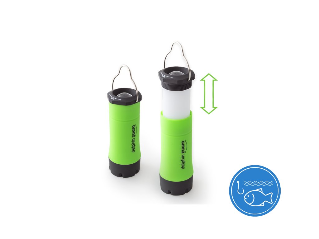 Příruční svítidlo, bez kterého se odteď neobejde žádná vaše vycházka k vodě. Delphin ZUUM je díky kompaktním rozměrům lehko přenosný a díky své multifunkčnosti přímo nenahraditelný společník za zhoršených světelných podmínek. Je ho možné použít jako klasické svítidlo do ruky, kdy světlo svítí přímým směrem z otočné hlavice. Pootočením je ale možné povytáhnout středovou část a udělat tak z baterky svítilnu. Tato svítilna sama stojí a navíc díky profilovanému drátěnému háčku ji můžete bez problémů i zavěsit. Tím ale výčet vlastností stále nekončí. Samotná LED dioda ve vnitřku má tři úrovně svícení: silné světlo, tlumené světlo a blikající stroboskop. Možnosti Delphin ZUUM jsou tedy nekonečné, od klasického ručního svítidla přes závěsnou svítilnu, světlo do bivaku, poziční světlo... ZUUM je nabízený ve 3 barevných provedeních těla: zelená, oranžová a modrá. Technické parametry: Rozměr: 10x4x4cm Napájení: 3xAAA Svítidlo Delphin ZUUM je do prodejen dodávané v pultových plnobarevných prezentérech, přižemž každý obsahuje 18ks svítidla (6x zelené, 6x oranžové a 6x modré).Doplňkové parametry