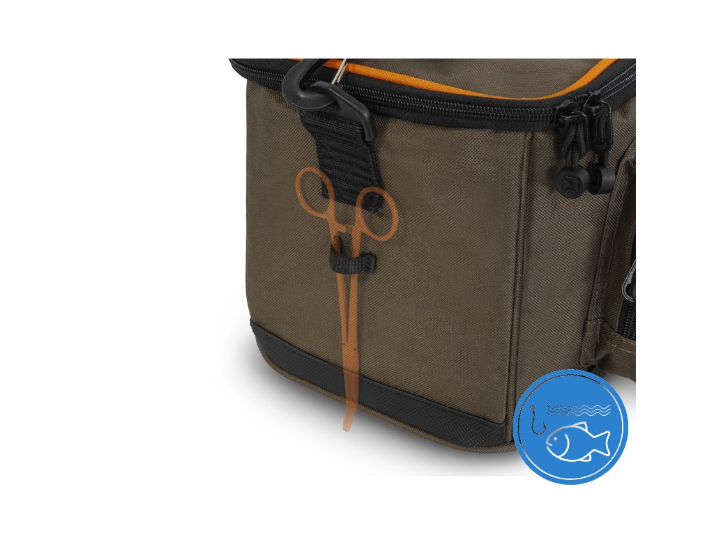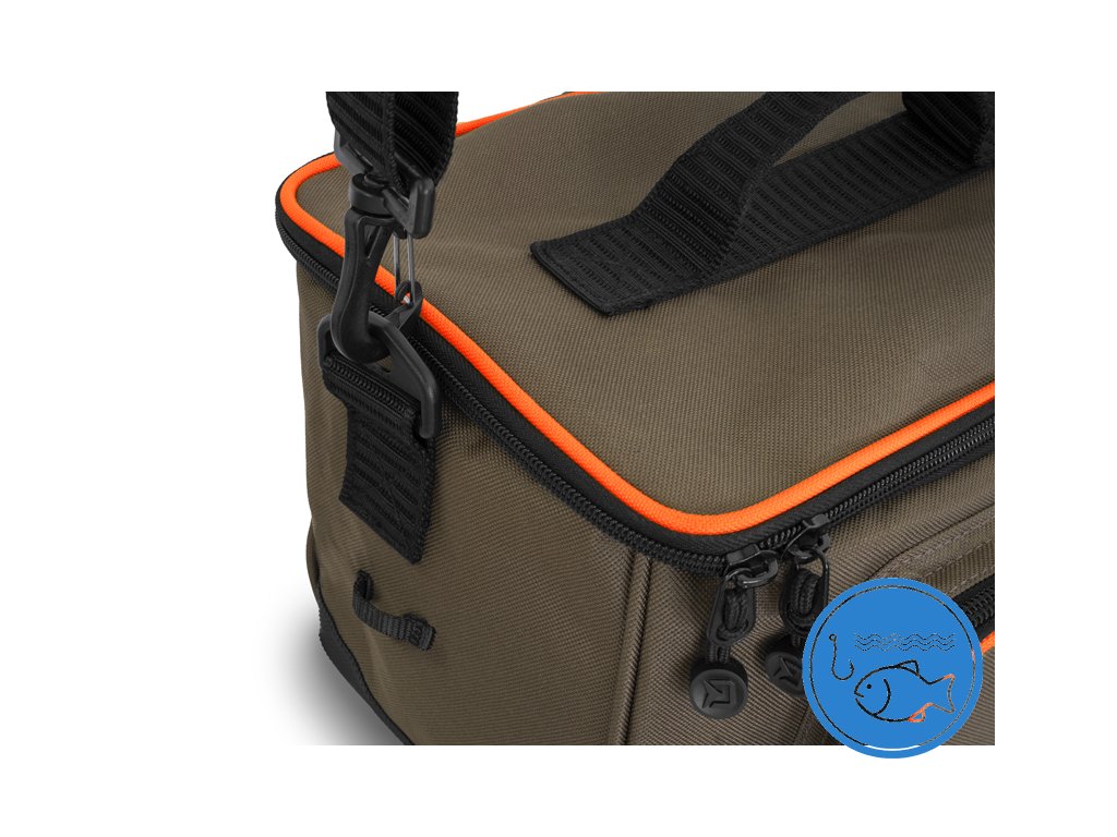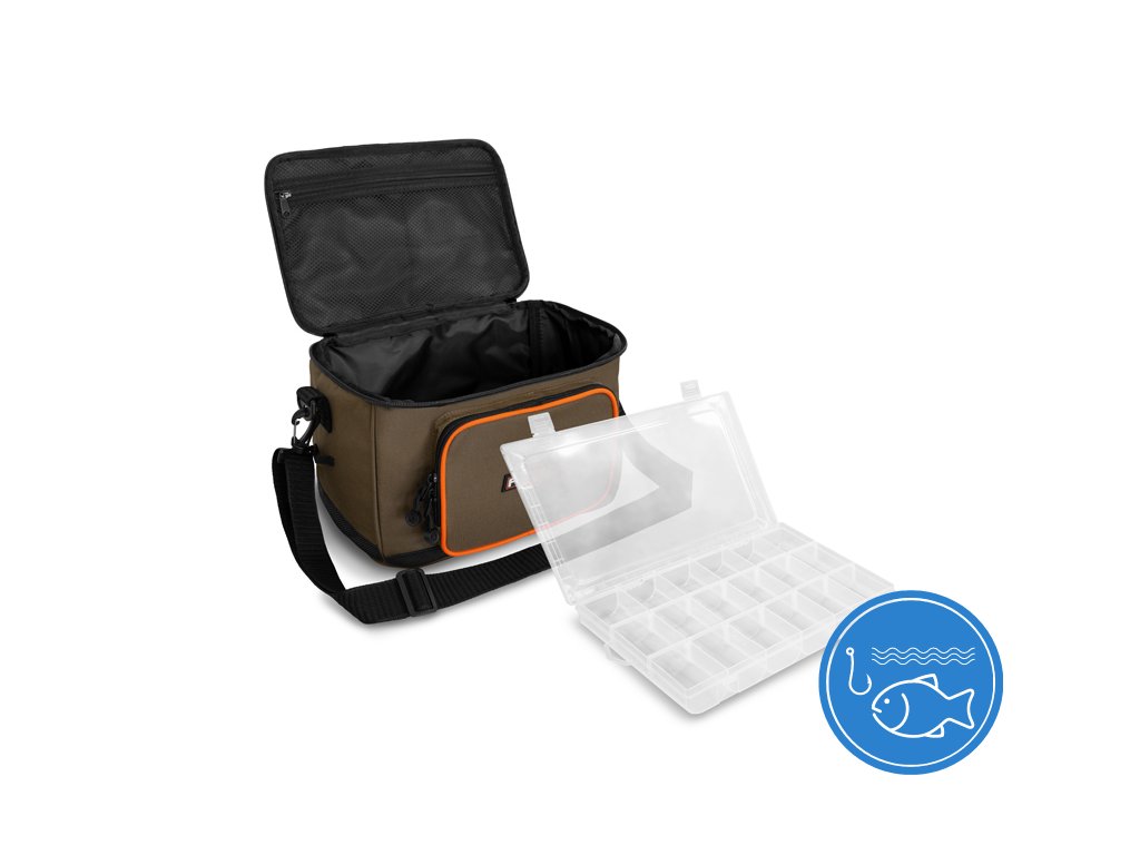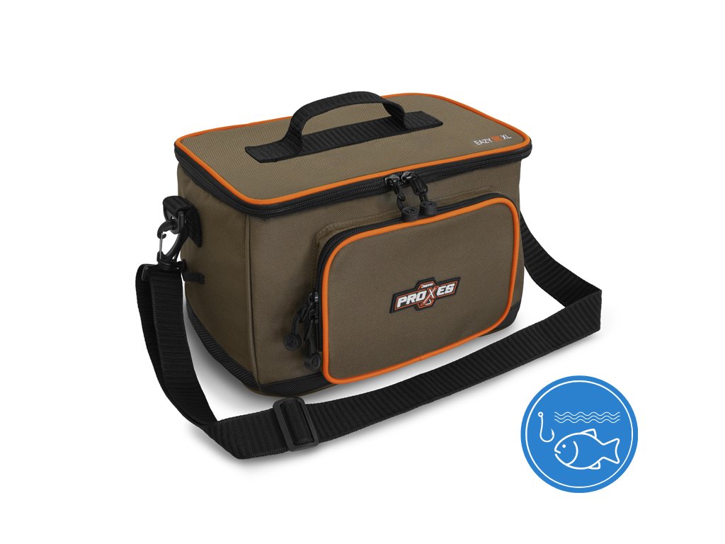 Delphin PROXES Easy XL je kompaktní praktická taška, jejíž univerzálnost a provedení ocení zejména příznivci přívlače, feederu či plavané. Easy XL, ale i jiné produkty ze série PROXES jsou specifické kvalitním provedením, vysokou praktičností, 100% funkčností a to vše za velmi příjemnou pořizovací cenu. Barevná kombinace řady PROXES poskytuje decentní vzhled ladící s přírodou. Oranžové lemy představují příjemný kontrast a zároveň poskytují lepší viditelnost za nepříznivých povětrnostních podmínek nebo za šera. Taška je zhotovena z kvalitních a odolných materiálů. Navíc je její spodní část dodatečně chráněna gumovou vrstvou přesahující nad dno tašky pro zamezení prostupu vlhkosti z mokré země. Hlavní část tašky tvoří dostatečně velký úložný prostor, ve kterém je již v základu umístěn průhledný plastový box s pořadatelnými přihrádkami, díky čemuž budete mít dokonalý přehled nad jeho obsahem. Box je svými rozměry vhodný například na přívlačové nástrahy, feederová krmítka, či jiné menší příslušenství. Přístup do hlavního úložného prostoru poskytuje kvalitní zip s taháčky a s logem značky Delphin. Víko tašky z vnitřní strany navíc ukrývá zipovatelnou kapsu ze síťoviny pro uložení drobné rybářské bižuterie nebo dokladů. Kromě toho taška nabízí další ukládací prostor ve formě zipovatelné kapsy na přední straně. Protože u všech našich produktů dbáme na detaily, i u tašky Easy XL jsme na obou stranách tašky přidali poutka pro vložení peanu nebo kleští. Tašku lze pohodlně přenášet pomocí kvalitního, odepínatelného, délkově nastavitelného popruhu pro nošení přes rameno, nebo pomocí textilní rukojeti umístěné na víku. Technické parametry XL Vnější rozměry: 30x26x19,5cm Rozměr hlavní části: 30x21x19,5cm Rozměr přední kapsy: 21x15x3cm Rozměr krabice: 27x18x4cmDoplňkové parametry