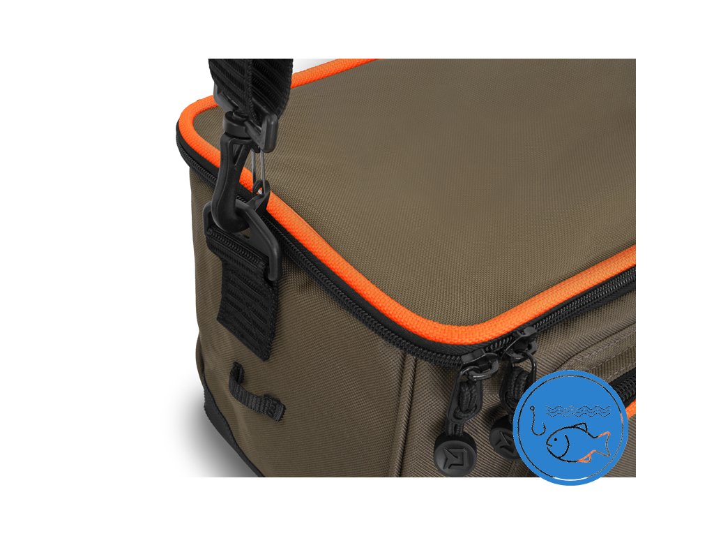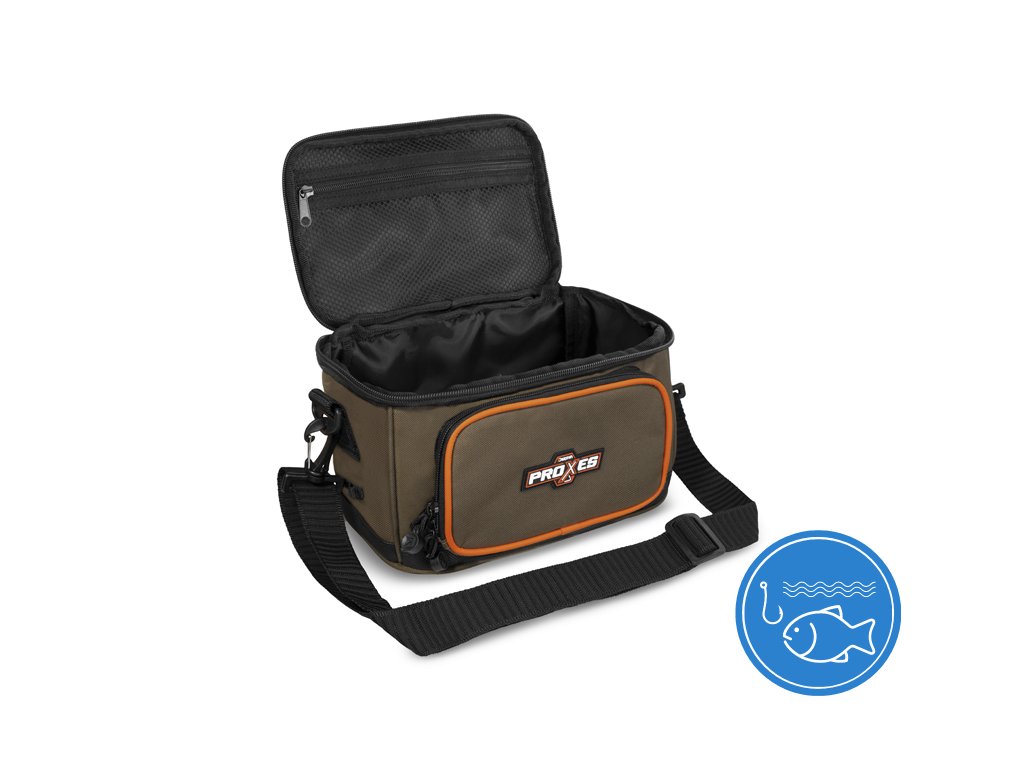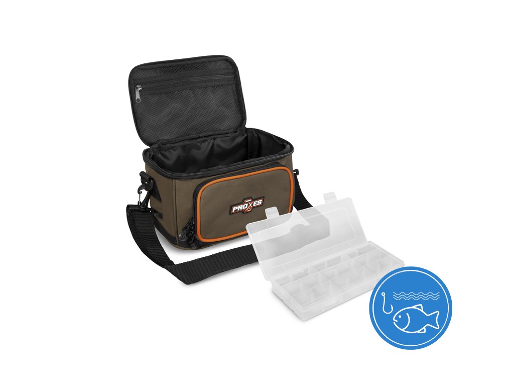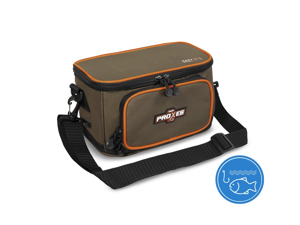 Delphin PROXES Easy L je kompaktní praktická taška, jejíž univerzálnost a provedení ocení zejména příznivci přívlače, feederu či plavané. Easy L, ale i jiné produkty ze série PROXES jsou specifické kvalitním provedením, vysokou praktičností, 100% funkčností a to vše za velmi příjemnou pořizovací cenu. Barevná kombinace řady PROXES poskytuje decentní vzhled ladící s přírodou. Oranžové lemy představují příjemný kontrast a zároveň poskytují lepší viditelnost za nepříznivých povětrnostních podmínek nebo za šera. Taška je zhotovena z kvalitních a odolných materiálů. Navíc je její spodní část dodatečně chráněna gumovou vrstvou přesahující nad dno tašky pro zamezení prostupu vlhkosti z mokré země. Hlavní část tašky tvoří dostatečně velký úložný prostor, ve kterém je již v základu umístěn průhledný plastový box s pořadatelnými přihrádkami, díky čemuž budete mít dokonalý přehled nad jeho obsahem. Box je svými rozměry vhodný například na přívlačové nástrahy, feederová krmítka, či jiné menší příslušenství. Přístup do hlavního úložného prostoru poskytuje kvalitní zip s taháčky a s logem značky Delphin. Víko tašky z vnitřní strany navíc ukrývá zipovatelnou kapsu ze síťoviny pro uložení drobné rybářské bižuterie nebo dokladů. Kromě toho taška nabízí další ukládací prostor ve formě zipovatelné kapsy na přední straně. Protože u všech našich produktů dbáme na detaily, i u tašky Easy L jsme na obou stranách tašky přidali poutka pro vložení peanu nebo kleští. Tašku lze pohodlně přenášet pomocí kvalitního, odepínatelného, délkově nastavitelného popruhu pro nošení přes rameno, nebo pomocí textilní rukojeti umístěné na víku. Technické parametry L: Vnější rozměry: 27x19x16cm Rozměr hlavní části: 27x16x16cm Rozměr přední kapsy: 16x11x3cm Rozměr krabice: 23x12x4cmDoplňkové parametry