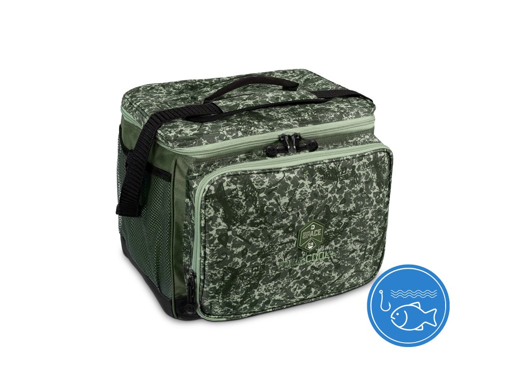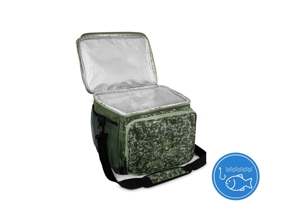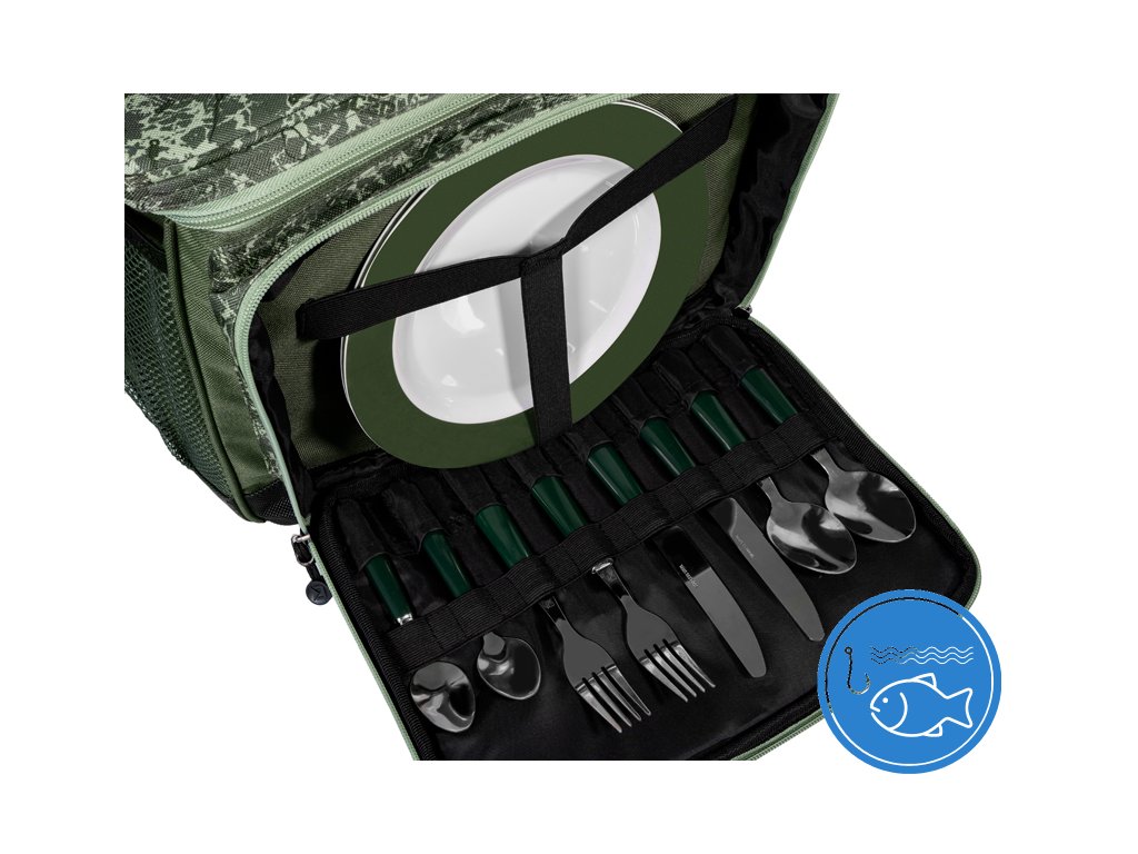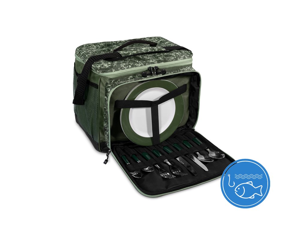 Delphin SPACE je označení pro exkluzivní sérii tašek z dílny značky Delphin. Vyznačuje se špičkovým zpracováním, kvalitními zipy, ale zejména výjimečným designem s použitím C2G kamufláže. Termotaška s příborem Delphin FullCOOL C2G je určena na převoz potravin s potřebou co nejdelšího uchování jejich původní teploty. Celá taška je z vnitřní strany opatřena termovrstvou. Zároveň je osazena polstrováním o síle 8mm, což zajišťuje její stabilitu, i když je prázdná. Tato vrstva polstrování se chová jako dodatečný izolant a zvyšuje tak dobu uchování potravin. Termoizolační vrstva byla navržena tak, že překrývá vnější okraj o 1cm a zároveň je všitá i pod celý obvodový zip. Výrazně tím prodlužuje dobu ochrany nástrah či potravin. V případě, že by tato vrstva nebyla všitá pod zipem, vzduch proudící přes zip by mnohem rychleji vnikal dovnitř. Taška je z boku dodatečně osazena dvěma síťkami, které slouží jako úložný prostor. V přední části je velká kapsa, ve které je umístěna kompletní jídelní sada pro dvě osoby. Obsahuje dva kusy plastových talířů, dva nože, dvě vidličky, dvě lžíce a dvě malé dezertní lžičky. Odteď si můžete dopřát více komfortu, i když jste u vody se svou polovičkou nebo parťákem! Pro pohodlné nošení je taška FullCOOL C2G vybavená odepínatelným pásem na rameno a měkce polstrovanou rukojetí. Stylová patentovaná kamufláž z dílny značky Delphin pod označením C2G má mnoho podob a úhlů pohledu. Přesně tak i její název, který můžeme volně přeložit jako Carpath 2. generace, což přímo odkazuje na jejího předchůdce, ale můžeme jej číst i jako Carpath to Green, tedy přechod myšlenky Carpathu do zelené barvy. Její jedinečnost a nezaměnitelnost spočívá v prvcích, ze kterých je vytvořena. Na první dojem jde o kamufláž tvořenou třemi různými odstíny zelené. Všechno se však změní při detailnějším pohledu, kdy si všimnete siluety kaprů, komponent kaprařské montáže a log značky Delphin spolu s označením C2G. Díky tomuto neopakovatelnému provedení se vaše rybářská výbava okamžitě stane jedinečnou a maximálně originální.Doplňkové parametry