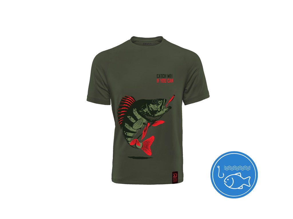 Série stylových a pohodlných triček s vyobrazením ryb, vhodných nejen na ryby, ale také k běžnému nošení. CATCH ME IF YOU CAN (Chyť mě, pokud to dokážeš) se nepochybně stane jedinečným kouskem každého rybářského šatníku, díky kterému se u vody odlišíte. Tričko Catch me! OKOUN je designované v tmavě zelené barvě s vyobrazením okouna, který se právě blíží k nástraze, což je moment, na který čekají všichni příznivci lovu těchto ryb. Samotné tričko je vysoké kvality, stejně jako použitý barevný tisk. Nabízíme je v široké škále velikostí od S až po KING SIZE (ekvivalent 4+XL, který je ve většině zemí označován jako XXXXXL). Model King size tedy hravě oblékne i ty nejstatnější rybáře o hmotnosti 135kg+. Složení: 100% bavlnaDoplňkové parametry