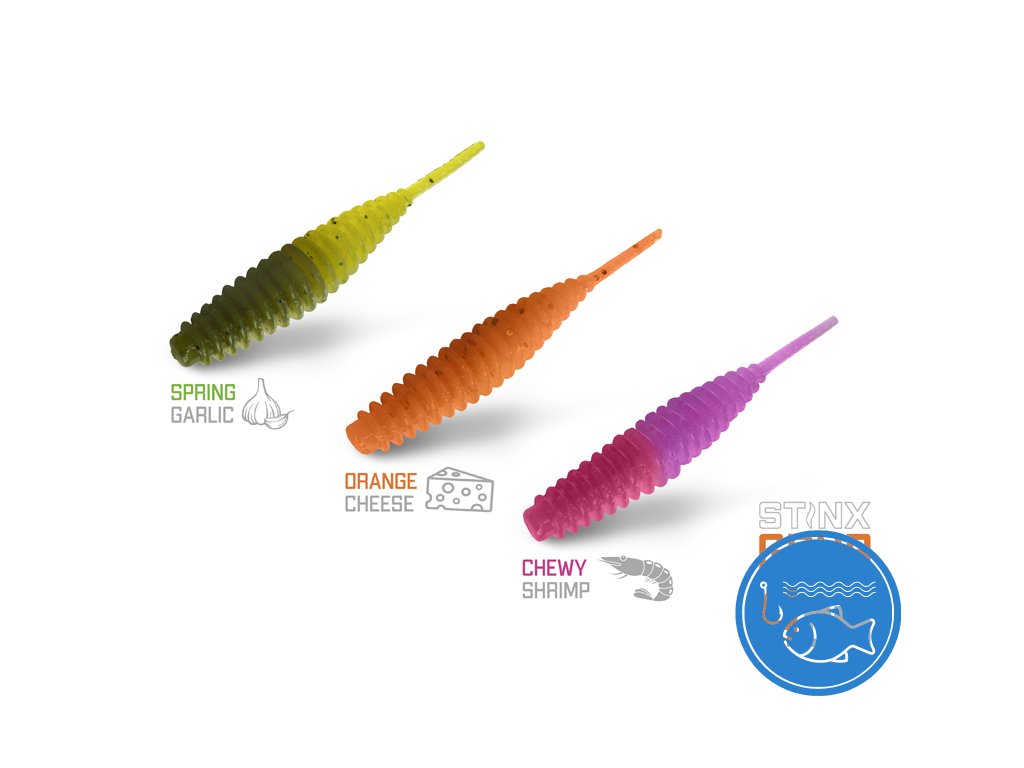 Umělá nástraha Delphin B! StinxGRUB Je měkká nástraha imitující červy nebo různé vodní bezobratlé, vhodná zejména pro vyznavače ultralehké přívlače. Díky univerzálnímu tvaru nástrahy ji lze nastražit různým způsobem a lovit různé druhy ryb. Své uplatnění najde při lovu pstruha či okouna, určitě jí však nepohrdne i větší dravec či kaprovitá ryba. Štíhlé válcovité tělo a výrazným obvodovým žebrováním po celé délce dodává nástraze velmi specifický pohyb a neodolatelné vibrace. Plovoucí materiál způsobuje nadnášení ve vodě, čímž nástraha působí velmi živě. Nástraha je k dispozici v několika účinných barevných kombinacích, které jistě zaujmou zrak nejednoho dravce. Použité barvy jsou navíc UV aktivní, což způsobuje intenzivnější odraz slunečního záření pod vodou, díky čemuž se nástrahy stávají nepřehlédnutelnými i ve velkých hloubkách nebo za slabých světelných podmínek. Pro zvýšení atraktivity jsou nástrahy uloženy v nádobě s tekutým atraktantem, do kterého lze opětovně uložit použitou nástrahu, a tak ji znovu zaromatizovat. Různé příchutě nástrah umožňují lepší přizpůsobení se lovu cílové ryby nebo jejich aktuální chuti.Doplňkové parametry