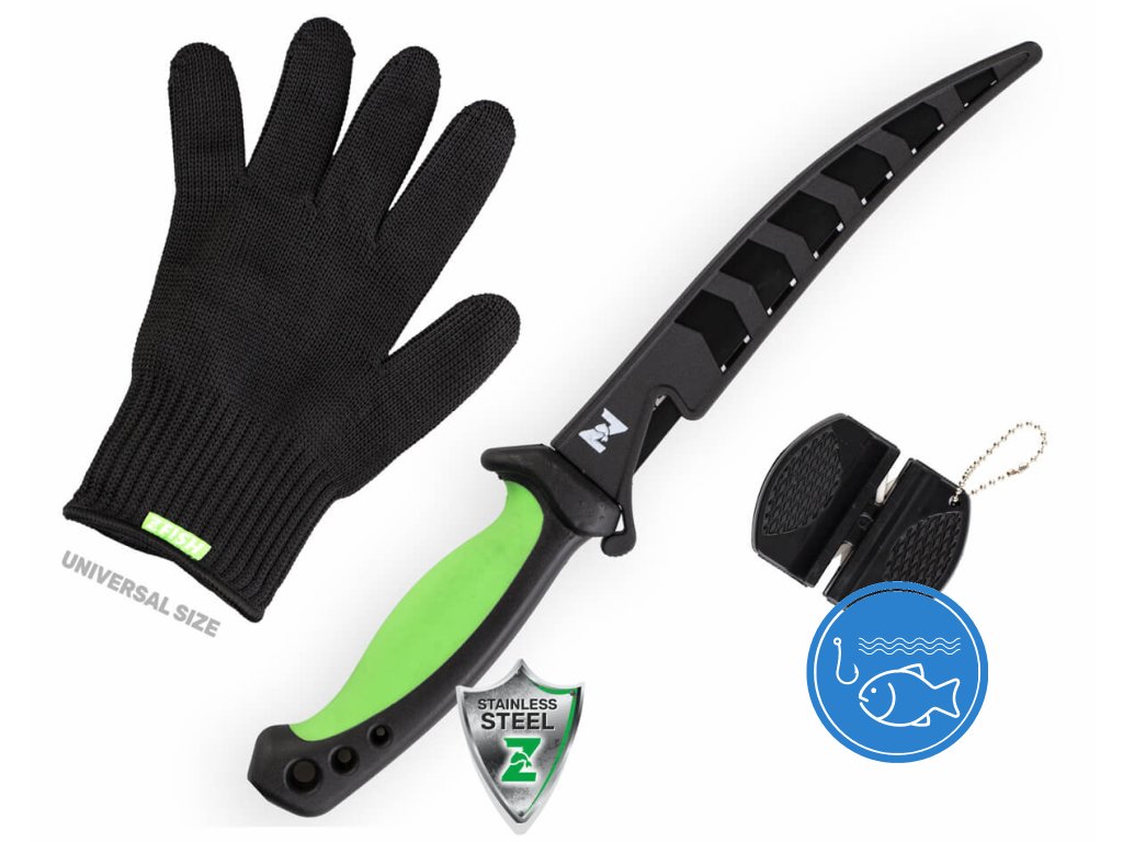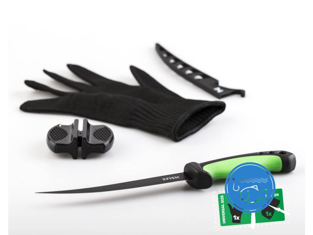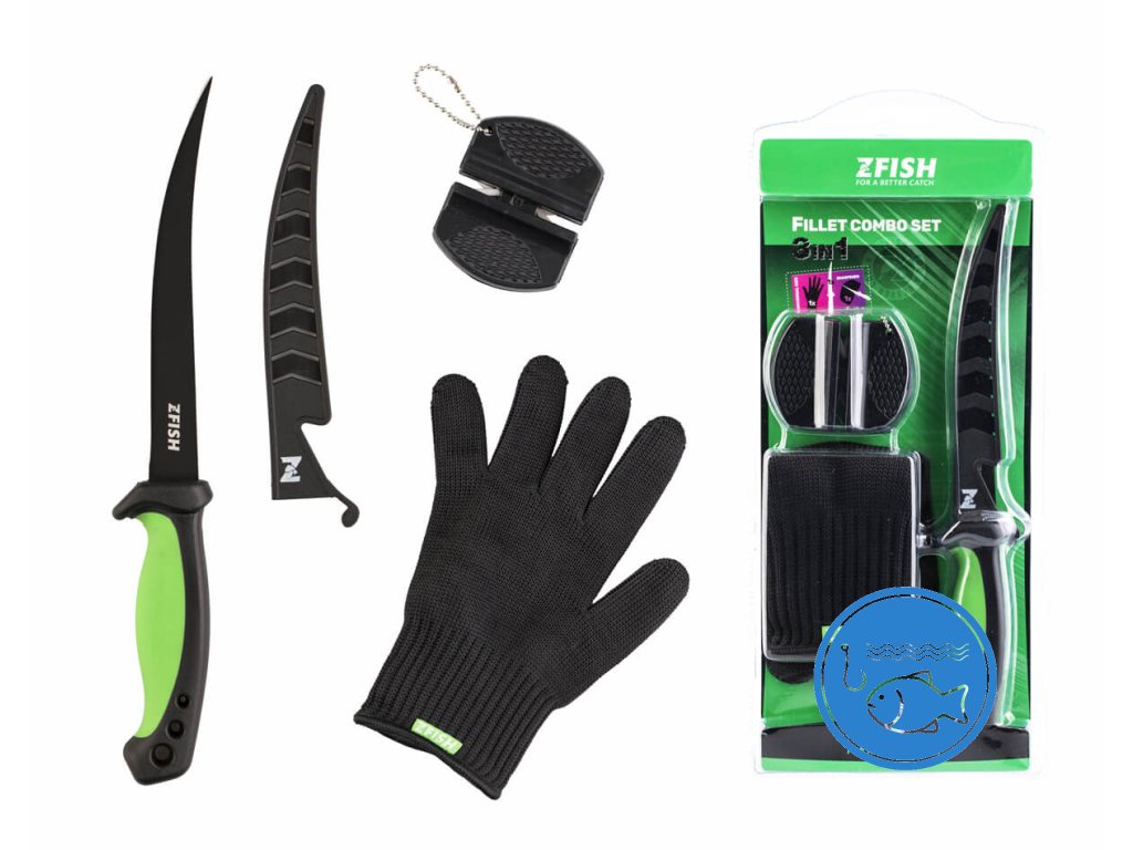 ZFISH Fillet Combo Set je combo sada složená z kvalitního filetovacího nože s pevným ochranným pouzdrem, silných rukavic z kevlarového vlákna proti pořezání a brousku na nůž.