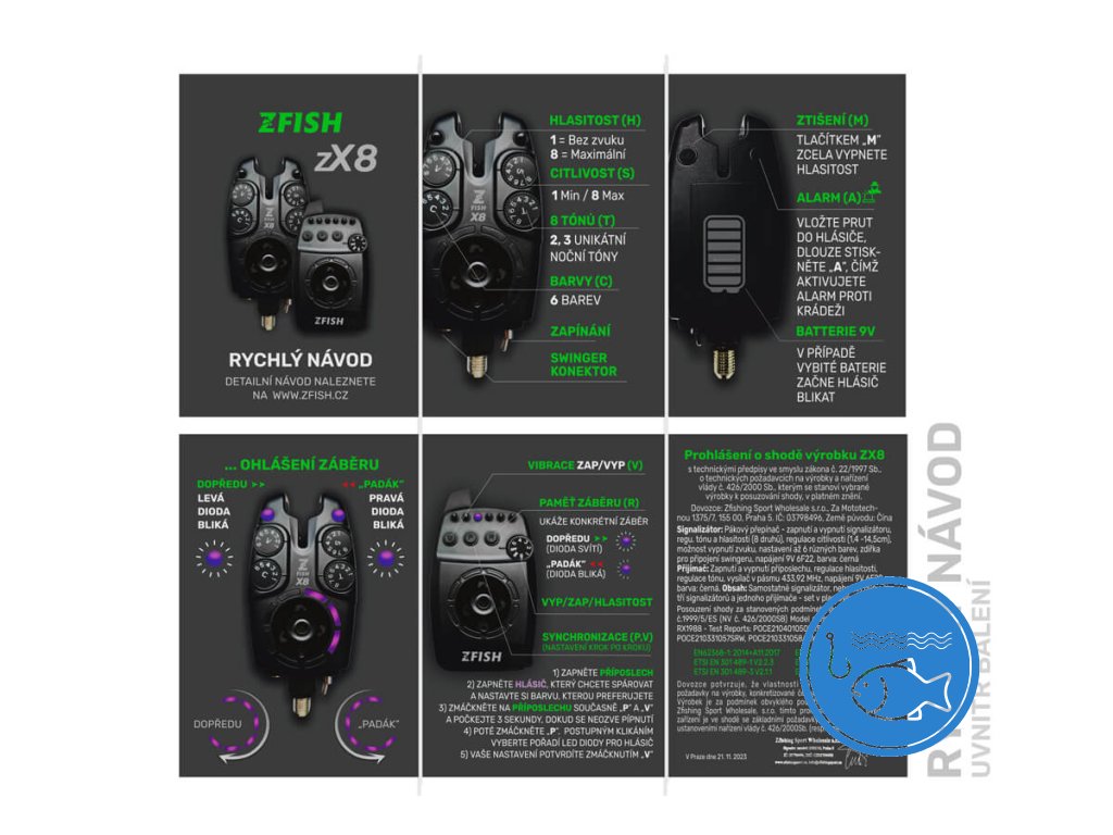 ZFISH Bite Alarm Zx8 je nepochybně naše nová vlajková loď mezi hlásiči. Při vývoji a navrhování těchto hlásičů jsme kladli důraz na odstranění všech běžných nešvarů a můžete si být jistí, že tyto hlásiče jsou skutečně “vymazlené” do posledního detailu, zkrátka hlásiče nové generace. Zx8 disponují 6-ti barvami a dokonce 8-mi zvukovými tóny ( z nichž 2 jsou zcela unikátní hluboké tóny speciálně navržené pro noční rybolov ) a navíc jsou opatřeny alarmem proti krádeži. Další užitečnou funkcí je paměť záběrů, která vám umožní zjistit zda jste měli “jízdu” (záběr vpřed ), nebo takzvaný “padák” ( zpětný záběr směrem k vám ). Samozřejmostí jsou vibrace příposlechu a snadné nastavení celkové citlivosti a hlasitosti. Zx8 byly testovány v extrémních podmínkách, takže za jejich odolnost proti vodě a prachu, můžeme dát ruku do ohně a navíc bezproblémů fungují až na vzdálenost 200m.
